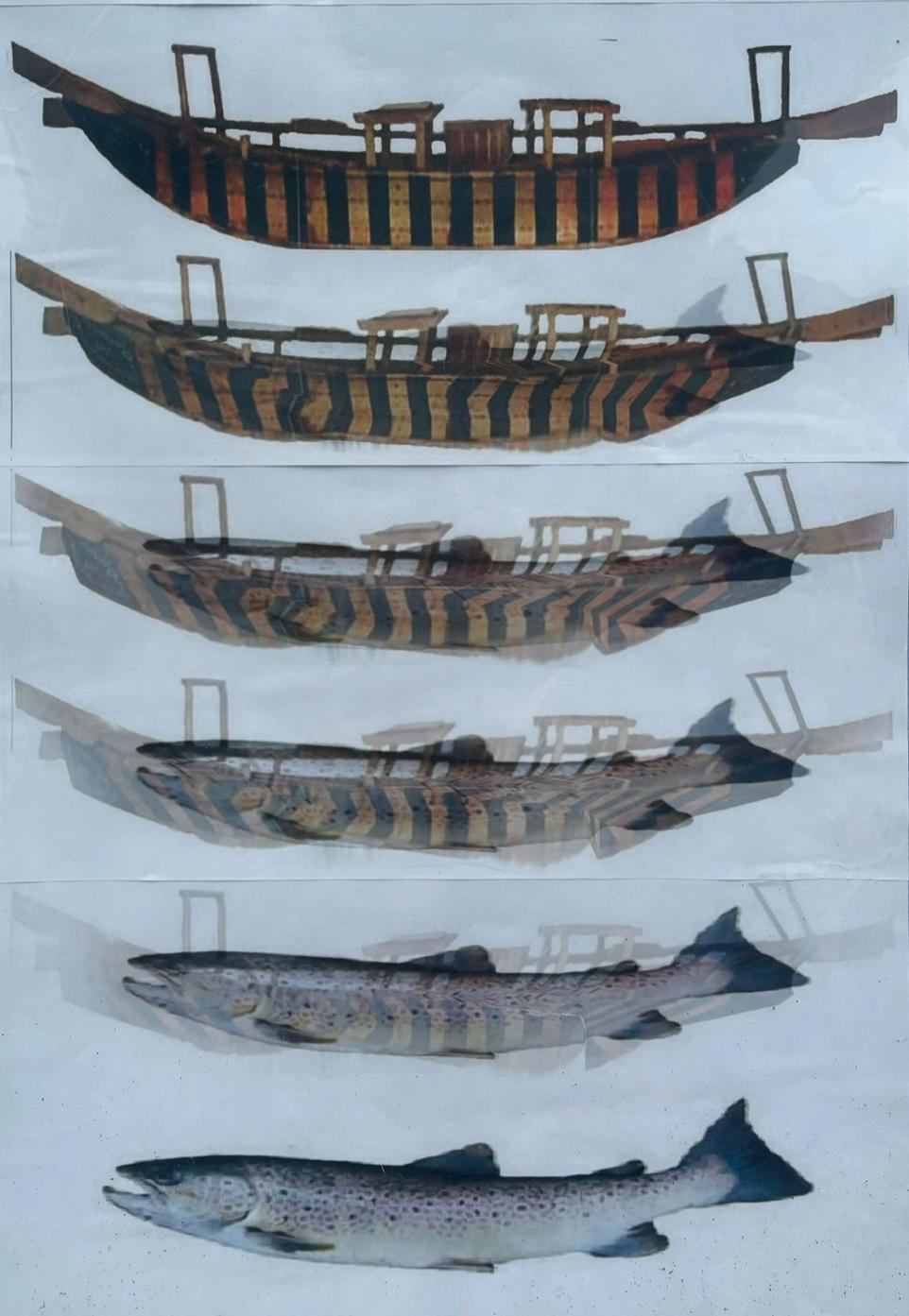 Die Bildfolge verdeutlicht anschaulich die enge Verbindung zwischen dem historischen Holzschiffbau, der Schopperei und der Fischerei - beides zentrale Themen unseres Museums. Die allmähliche Überblendung vom Schopperboot zum Fisch symbolisiert die Entwicklung vom technischen Handwerk zum Naturerlebnis und unterstreicht den thematischen Zusammenhang.